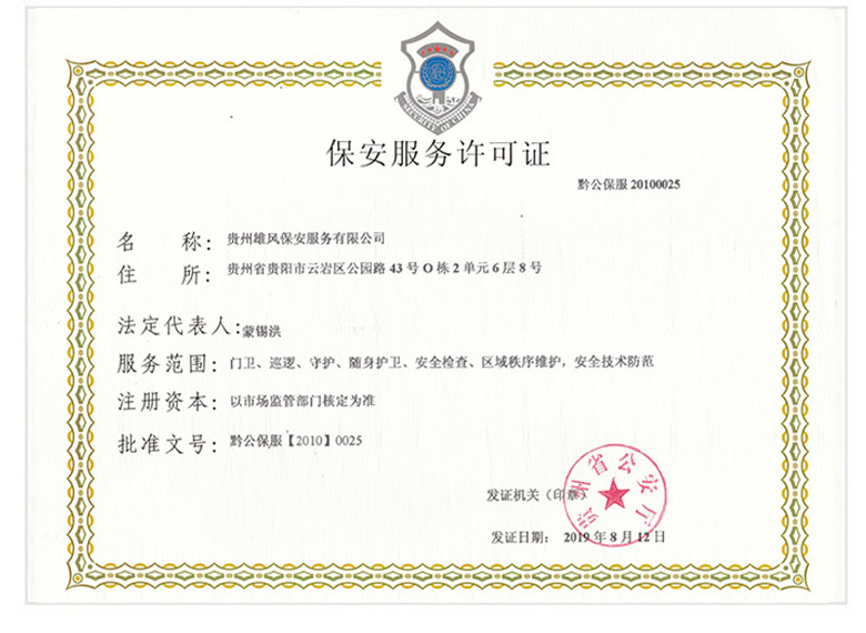 貴州雄風(fēng)保安服務(wù)有限公司(原武警貴州省總隊(duì)金盾保安公司,成立于1992年)于2008年1月24日正式注冊(cè),是貴州省保安協(xié)會(huì)常務(wù)理事單位、貴陽(yáng)市保安協(xié)會(huì)副會(huì)長(zhǎng)單位。貴州雄風(fēng)保安服務(wù)有限公司經(jīng)貴陽(yáng)市公安局備案,貴州省公安廳治安總隊(duì)批準(zhǔn),獲得保安服務(wù)許可證,通過(guò)企業(yè)信用等級(jí)認(rèn)證并取得企業(yè)信用等級(jí)證書(shū)(AAA),具有獨(dú)立法人資格、勞務(wù)派遣經(jīng)營(yíng)許可證的企業(yè)。 我公司自成立以來(lái),始終堅(jiān)持“依法經(jīng)營(yíng),規(guī)范管理,優(yōu)質(zhì)服務(wù),信譽(yù)至上”的宗旨,恪守“從管理要素質(zhì),以素質(zhì)奪信譽(yù),從信譽(yù)贏(yíng)顧客,以服務(wù)創(chuàng)效益”的經(jīng)營(yíng)理念。公司已建立黨支部、工會(huì)等管理機(jī)構(gòu),下設(shè)辦公室、財(cái)務(wù)部、綜合部、人事部、管理部、督察部、培訓(xùn)部、法規(guī)部、1個(gè)大隊(duì)、8個(gè)中隊(duì)、13個(gè)分隊(duì)。在冊(cè)員工1000余人,F(xiàn)有服務(wù)網(wǎng)點(diǎn)118個(gè),業(yè)務(wù)覆蓋貴陽(yáng)、遵義、六盤(pán)水、黔南、安順等地區(qū)。 公司在確?蛻(hù)安全的基礎(chǔ)上,積極協(xié)助公安機(jī)關(guān)維護(hù)社會(huì)治安,在打擊違法犯罪活動(dòng)中充分發(fā)揮了保安職能作用,為經(jīng)濟(jì)建設(shè)保駕護(hù)航。2009年在“服務(wù)質(zhì)量評(píng)價(jià)調(diào)查活動(dòng)”中,跟蹤調(diào)查的65個(gè)服務(wù)單位,“守合同、講信譽(yù)”服務(wù)合格率為98%,得到客戶(hù)肯定和廣大市民的好評(píng)。取得較好的經(jīng)濟(jì)效益和社會(huì)效益。2008至今連續(xù)被轄區(qū)評(píng)為“納稅先進(jìn)企業(yè)”。目前,公司在做好縱向發(fā)展的基礎(chǔ)上,積極拓展橫向業(yè)務(wù),逐步向職業(yè)產(chǎn)業(yè)化邁進(jìn)。