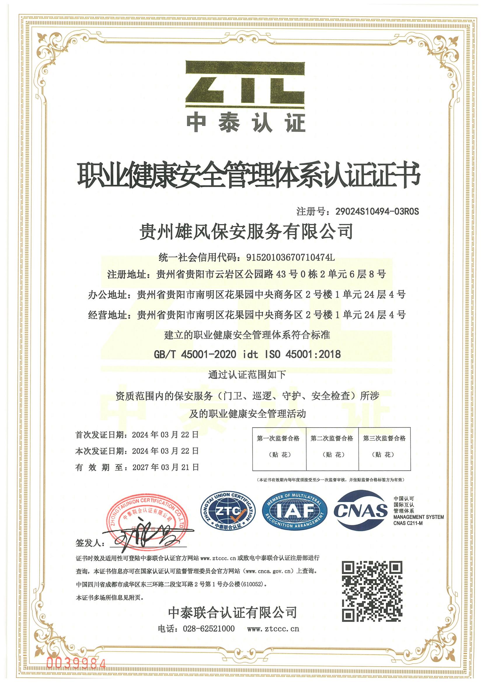 職業(yè)健康安全管理體系認(rèn)證證書