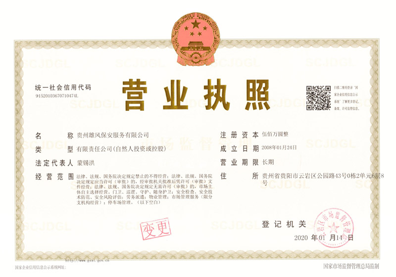 貴州雄風(fēng)保安服務(wù)有限公司(原武警貴州省總隊(duì)金盾保安公司,成立于1992年)于2008年1月24日正式注冊(cè),是貴州省保安協(xié)會(huì)常務(wù)理事單位、貴陽(yáng)市保安協(xié)會(huì)副會(huì)長(zhǎng)單位。貴州雄風(fēng)保安服務(wù)有限公司經(jīng)貴陽(yáng)市公安局備案,貴州省公安廳治安總隊(duì)批準(zhǔn),獲得保安服務(wù)許可證,通過(guò)企業(yè)信用等級(jí)認(rèn)證并取得企業(yè)信用等級(jí)證書(shū)(AAA),具有獨(dú)立法人資格、勞務(wù)派遣經(jīng)營(yíng)許可證的企業(yè)。 我公司自成立以來(lái),始終堅(jiān)持“依法經(jīng)營(yíng),規(guī)范管理,優(yōu)質(zhì)服務(wù),信譽(yù)至上”的宗旨,恪守“從管理要素質(zhì),以素質(zhì)奪信譽(yù),從信譽(yù)贏(yíng)顧客,以服務(wù)創(chuàng)效益”的經(jīng)營(yíng)理念。公司已建立黨支部、工會(huì)等管理機(jī)構(gòu),下設(shè)辦公室、財(cái)務(wù)部、綜合部、人事部、管理部、督察部、培訓(xùn)部、法規(guī)部、1個(gè)大隊(duì)、8個(gè)中隊(duì)、13個(gè)分隊(duì)。在冊(cè)員工1000余人,F(xiàn)有服務(wù)網(wǎng)點(diǎn)118個(gè),業(yè)務(wù)覆蓋貴陽(yáng)、遵義、六盤(pán)水、黔南、安順等地區(qū)。 公司在確?蛻(hù)安全的基礎(chǔ)上,積極協(xié)助公安機(jī)關(guān)維護(hù)社會(huì)治安,在打擊違法犯罪活動(dòng)中充分發(fā)揮了保安職能作用,為經(jīng)濟(jì)建設(shè)保駕護(hù)航。2009年在“服務(wù)質(zhì)量評(píng)價(jià)調(diào)查活動(dòng)”中,跟蹤調(diào)查的65個(gè)服務(wù)單位,“守合同、講信譽(yù)”服務(wù)合格率為98%,得到客戶(hù)肯定和廣大市民的好評(píng)。取得較好的經(jīng)濟(jì)效益和社會(huì)效益。2008至今連續(xù)被轄區(qū)評(píng)為“納稅先進(jìn)企業(yè)”。目前,公司在做好縱向發(fā)展的基礎(chǔ)上,積極拓展橫向業(yè)務(wù),逐步向職業(yè)產(chǎn)業(yè)化邁進(jìn)。